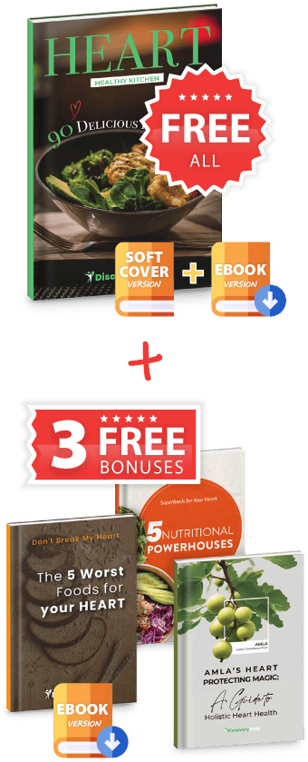 The free book 'Heart-Healthy Kitchen: 90 Delicious Recipes to Keep Your Heart Happy' valued at $39.90 and the three free bonus ebooks are all valued at $99.70